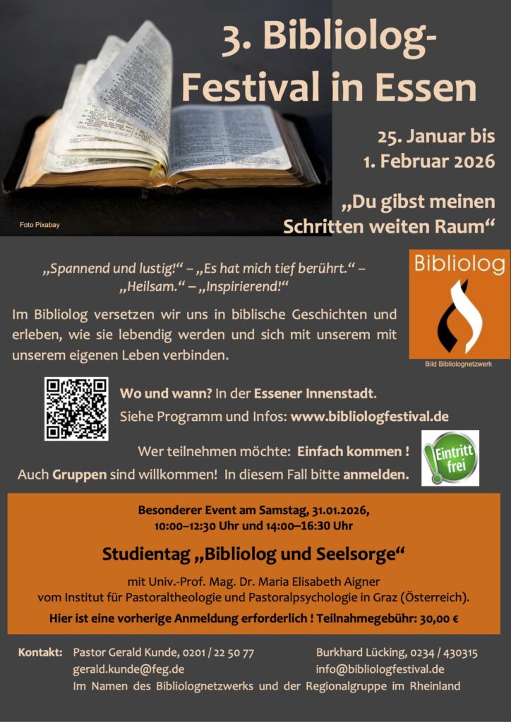 Ein Festival in etwa wie ein Musikfestival. Ganz viele Bibliologe, viel Begegnungen und Gemeinschaft. Eine Woche jeden Tag mindesten ein Bibliolog auf dem zentralen Festivalgelände in der Essener Innenstadt.